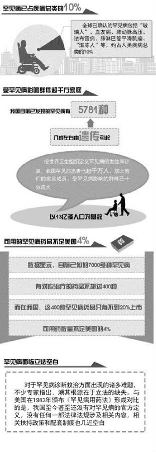 世界卫生组织将罕见病定义为患病人数占总人口的0.65%至1%之间的疾病或病变。相关数据显示,全球已确认的罕见病有7000多种,包括“玻璃人”、血友病、肺动脉高压、法布雷病、肺淋巴管平滑肌瘤、“渐冻人”等,约占人类疾病总类的10%。我国目前已发现的罕见病有5781种,八成左右由遗传引起,其中可治的仅有1%。